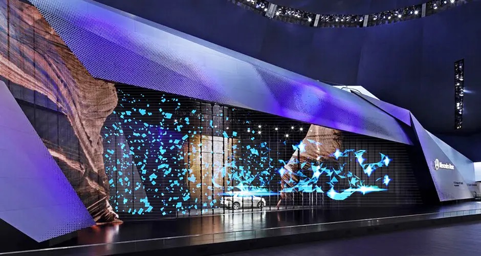 傳統(tǒng)的LED屏在不顯示時如一塊黑幕,且在室外或者光照下顯示背光,效果并不理想。華邦瀛系列透明LED顯示屏透風(fēng)、透光,不遮擋視線,室內(nèi)展示與采光兼得。遇到不規(guī)則的建筑龍骨可以通過定制模組與龍骨完美貼合,與建筑融為一體。
